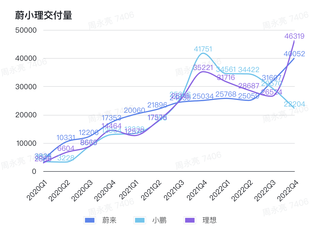 进入 2023 年后,蔚小理的差距还在逐渐拉大。根据财报预估数据,小鹏 2023 年一季度交付量在 1.8-1.9 万辆,同比下降 45%-47.9%。相比之下,理想预计销量 5.2 万-5.5 万辆,蔚来为 3.1 万-3.3 万辆,同比增长 20.3% 至 28.1%。