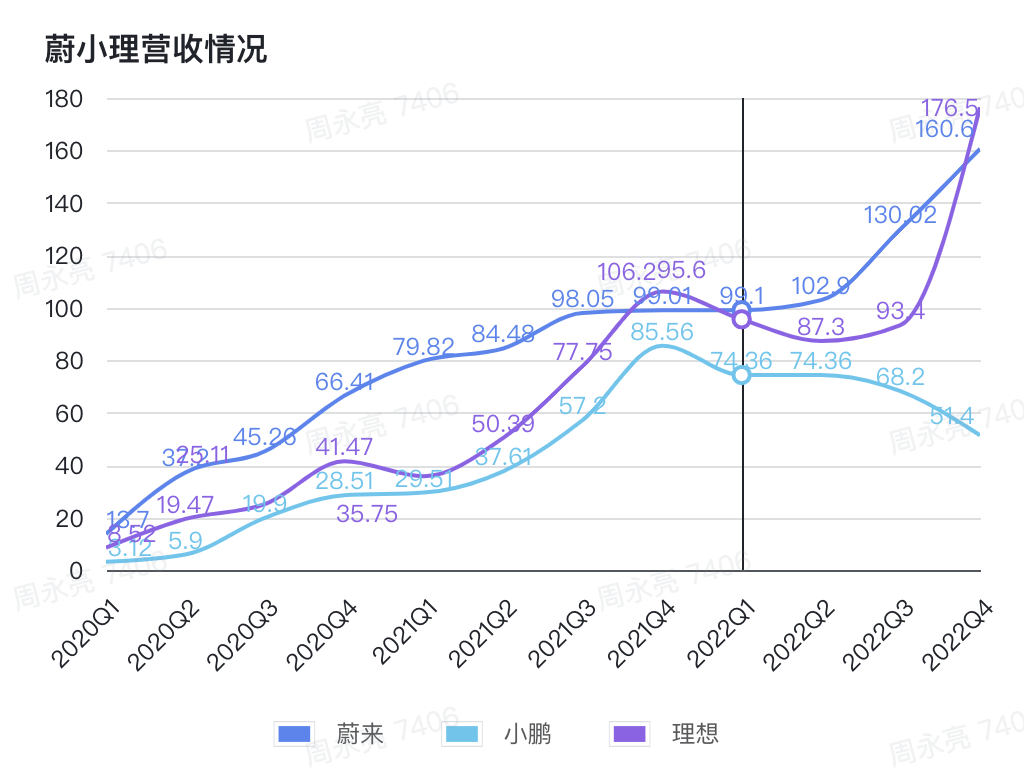 仅从这个数字来看,三家的差距并不悬殊,但反映到营收,却有着不小的差距。在收入方面,2022 年,蔚来收入 493 亿元,在蔚小理中是最高的。理想、小鹏分别是 453 亿元、269 亿元。