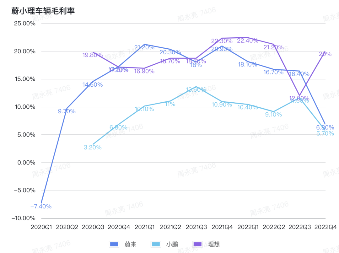 销量、营收正在转好,毛利率却急转直下。数据显示,蔚来去年的汽车毛利率为 13.7%,而 2021 年为 20.1%,同比下降 6.4 个百分点。相比之下,理想只是从 20.6% 微降到 19.1%,小鹏则从 11.5% 降到 9.4%。