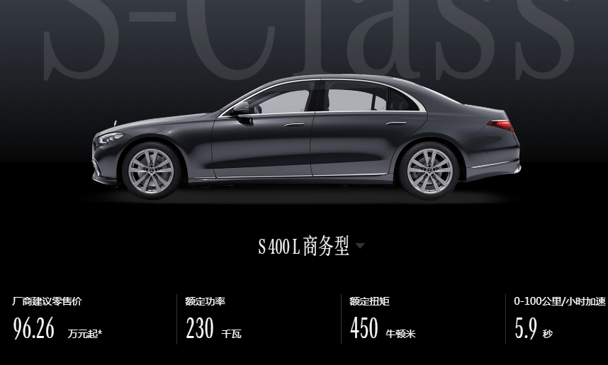 新款奔驰S级现已正式上市,官方指导价96.26万元起。新款奔驰S级在官网仅展示了S400 L商务型、S400 L豪华型以及S 450 L 4MATIC共3款车型,3.0T发动机的S 500 L 4MATIC车型将不再供应。值得一提的是,新款奔驰S级的指导价有所上涨,其中S400 L商务型由94.72万元调整为96.26万元,S400 L豪华型的售价则从107.85万元变更为110.68万元,S 450 L 4MATIC的指导价从128.45万元上调至130.26万元。