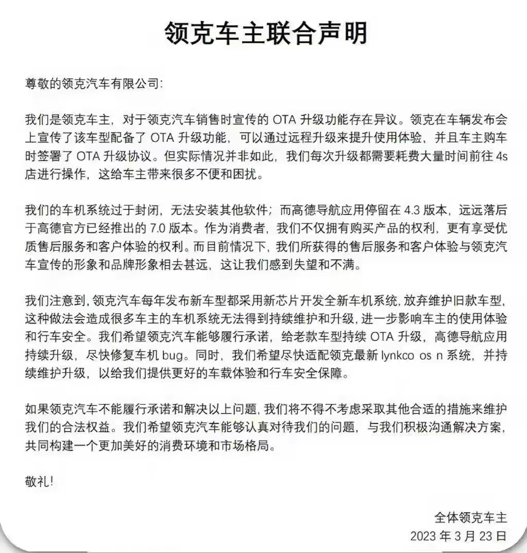 2023年2月23日夜,多名领克车主在领克汽车官方App中发布“领克车主联合声明,称领克汽车承诺的OTA空中升级不实,每次升级需前往4S店进行操作,为车主带来很多不便和困扰;此外,车机系统过于老旧,且无法安装其他应用软件。在声明中,领克认为官方这一做法“放弃维护旧款车型,影响用户体验”。因此,领克车主在声明中要求“持续给老款车型推出OTA升级,修复车机BUG”。