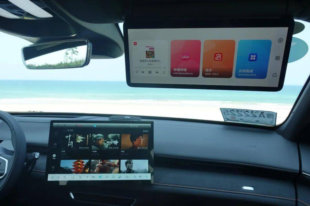 值得一提的是,深蓝S7在常规的副驾遮光板位置,还安装了一块可折叠的12.3英寸超感智慧屏,并可实现三屏联动分享等功能,配合副驾座椅的倾斜角度调整,方便副驾乘员以舒适的躺姿观看屏幕播放内容。