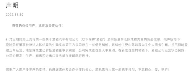 这也直接导致其卸任爱驰汽车董事长之职,尽管爱驰汽车发表声明陈炫霖确实存在债务纠纷,但并不影响爱驰正常经营。但作为爱驰的投资人,显然对于爱驰的融资产生不小的影响,尤其是当下的投资环境下。