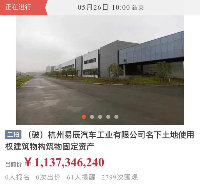 除了工业用地使用权和工业厂房外,拍卖的资产还包括冲压、焊装、涂装、总装四条整车生产线设备、高低床638个等,还包括园区内的各种绿化树木。这些资产,在5月4日就已经进行过一次拍卖,当时的起拍价高达14.21亿元起,但无人问津,于是此次二拍的拍卖价格直接打了八折。不过目前来看,依旧是无人报名、无人出价的状态。