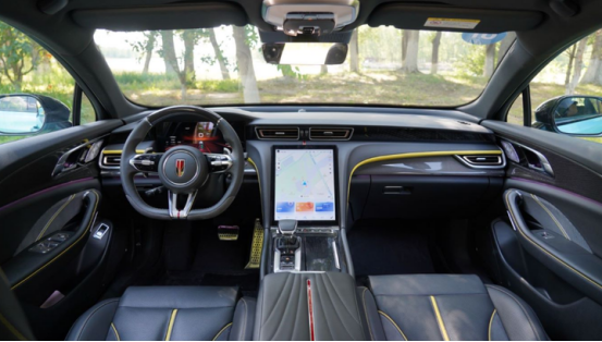 内饰方面,红旗H6以“清简中正”为设计主旨,以金盏黄和黑色为主要搭配配色,着重突出高级感。车内大面积采用了皮革等软质材料覆盖,方向盘是真皮+碳纤维材质,部分门板甚至为仿麂皮热压,工艺相当精致。