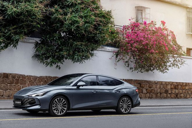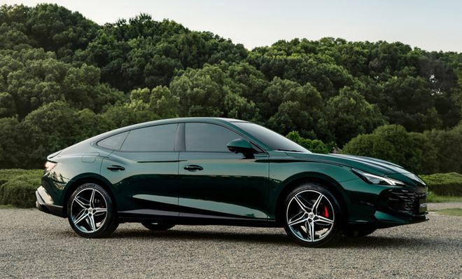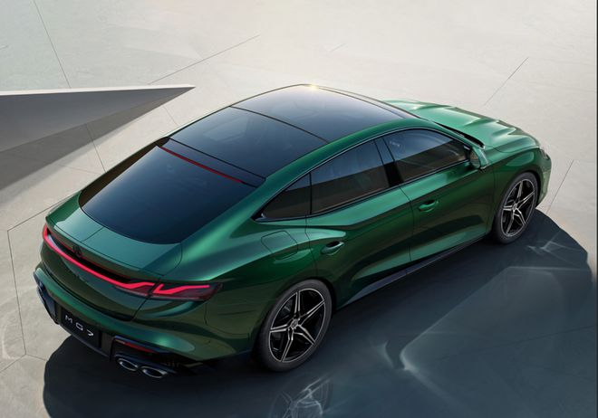 来到侧面,MG7的溜背式设计相当优雅。流畅的顶部曲线与后肩线完美呼应,让整车重心进一步下压,最终收尾于一根贯穿尾灯,致敬雪茄式英伦设计的韵味,加之无边框车门、19英寸的五辐式铝合金轮圈再配上红色的刹车卡钳,凸显了自身的与众不同。