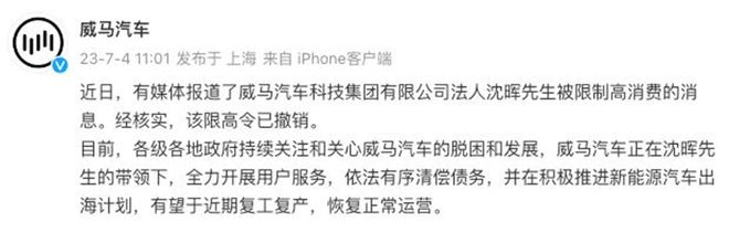 目前威马汽车官博发布声明称,“近日,有媒体报道了威马汽车科技集团有限公司法人沈晖先生被限制高消费的消息。经核实,该限高令已撤销。”声明称,威马汽车正全力开展用户服务,依法有序清偿债务,并在积极推进新能源汽车出海计划,有望于近期复工复产,恢复正常运营。