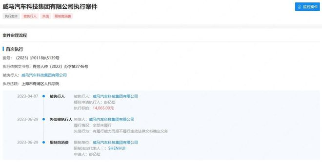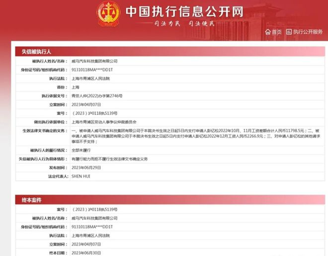 近日,据中国执行信息公开网消息显示,威马汽车科技集团有限公司新增一则限制消费令。信息显示,2023年4月7日立案的一起仲裁案件中,因法院判决的14065元未能够履行,法院认为威马汽车科技集团有限公司有履行能力而拒不履行生效法律文书确定义务,将公司及单位法定代表人SHEN HUI(沈晖)列为失信被执行人,也就是俗称的老赖。