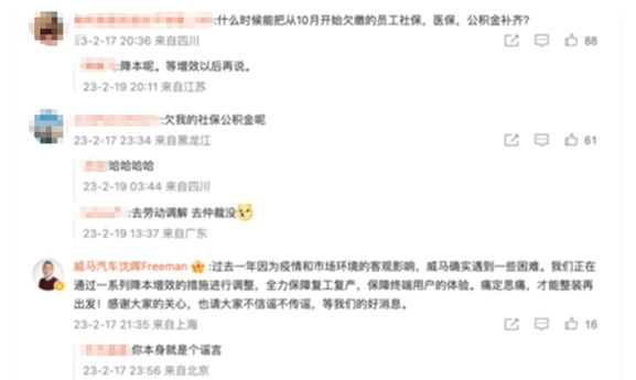 值得注意的是,威马汽车法人沈晖早在2022年年底在微博公开发声承认威马陷入经营困境,但表示正在积极复工复产,可惜这条微博下面已经被自家员工的讨薪留言给占领了。