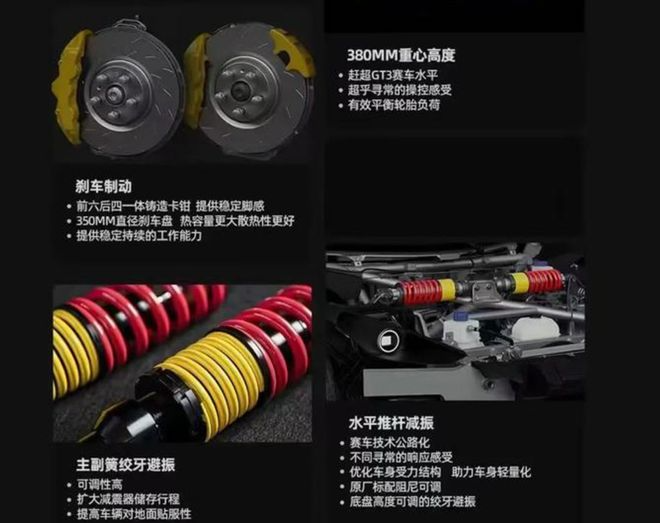 值得关注的是小跑车SC-01在驾驶性硬件上可以说是武装到了牙齿。前六后四活塞的铸造卡钳,350/380mm直径的刹车盘确保的车辆的制动性能。绞牙避震搭配水平推杆减震让车辆支撑性更充足,车辆的驾驶极限更高。
